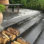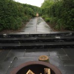 Stien op til the sunken garden flankeres af brede takshække og duftende roser på begge sider, indenfor hækkene ligger et imponerende fliseforløb. Sandstens stien er 180 cm bred og består af 2 rækker af de store 60×90 cm sandstensfliser der ligger i blokforband, mere roligt og stramt bliver det ikke! Dette understreges af flise valget som er den mest rolige, ens og stramme natursten i sortimentet – Black Limestone. En rigtig god sten der kløver meget ens og pænt. Lige når den er brudt, er den kulsort, men så snart den får lys begynder den af gråne og patinerer skifer grå. Derfor forhandles denne dejlige natursten også i hele verden og meget ofte kaldes den skifer eller skiffer, selv om det ikke er rigtigt – den er bare meget god at arbejde med og altid 100% vinterholdbar, og derfor foretrækkes den ofte fremfor skiferstenene.